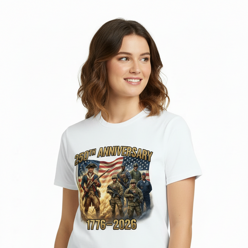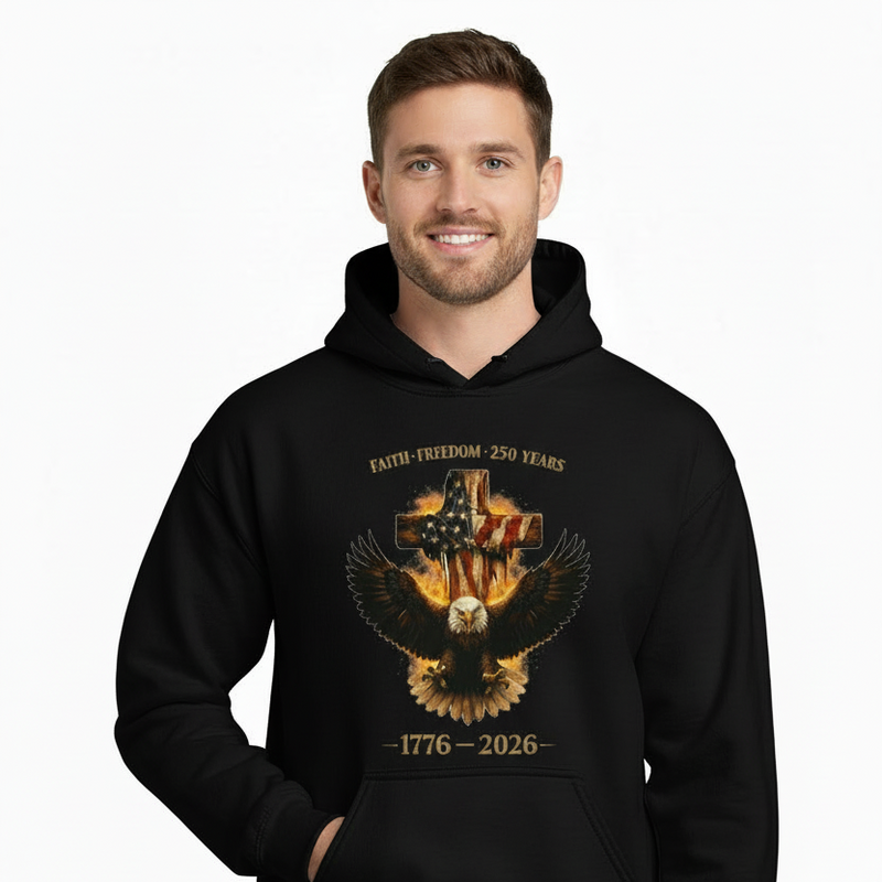 This powerful design locks eyes with history itself. A fierce bald eagle fills the frame, its gaze burning with purpose. One eye marked 1776, the other 2026, symbolizing 250 years of resolve, sacrifice, and independence. Red, white, and blue smoke swirls around the eagle’s face like living history. Not calm. Not quiet. Fully awake.